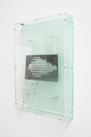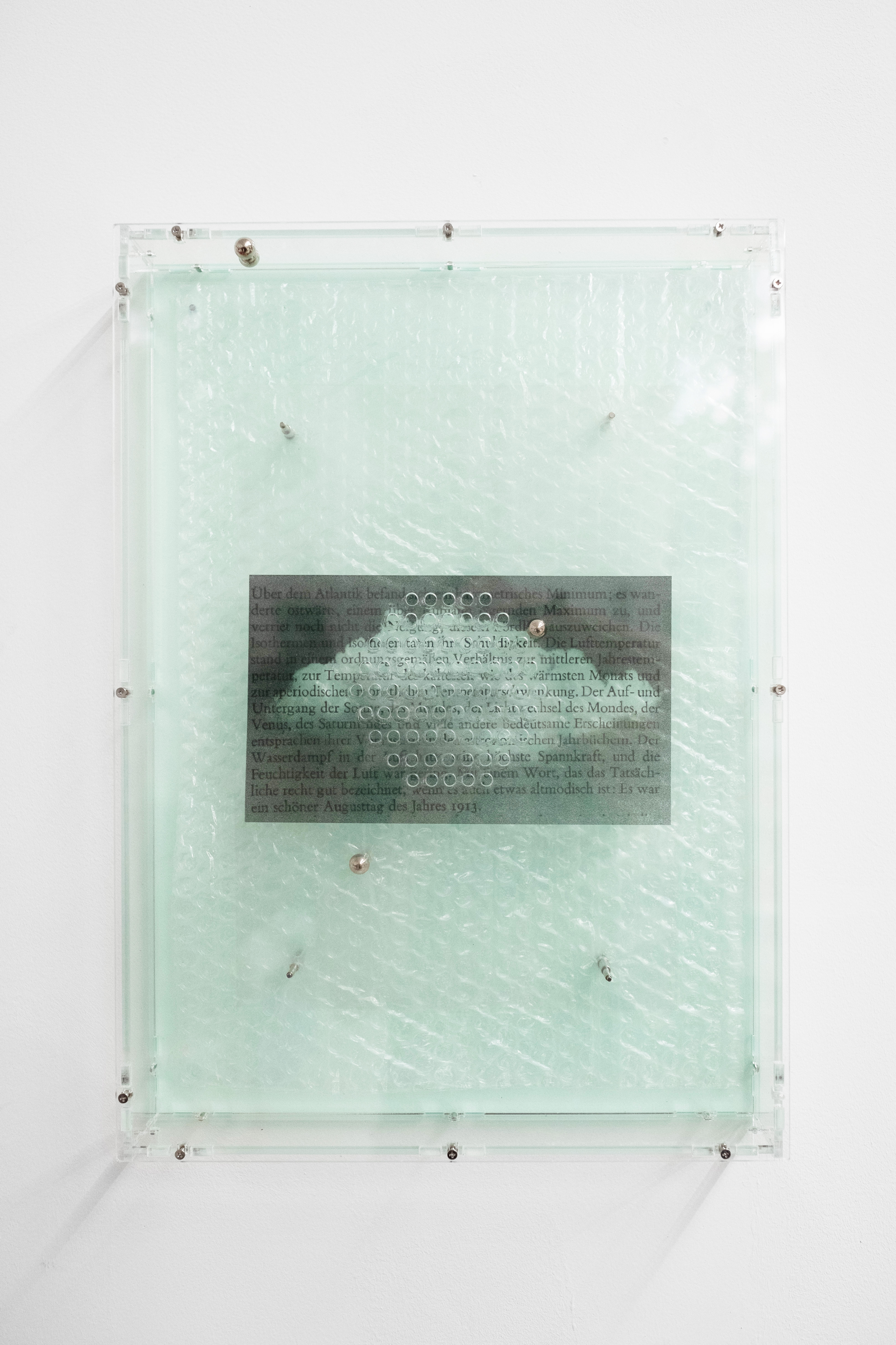Zur Topographie der Wolke (2024), Acrylglas, OHP-Folie, Luftpolsterfolie, Magnete, Schrauben, Text, 43 x 32 x 5 cm.